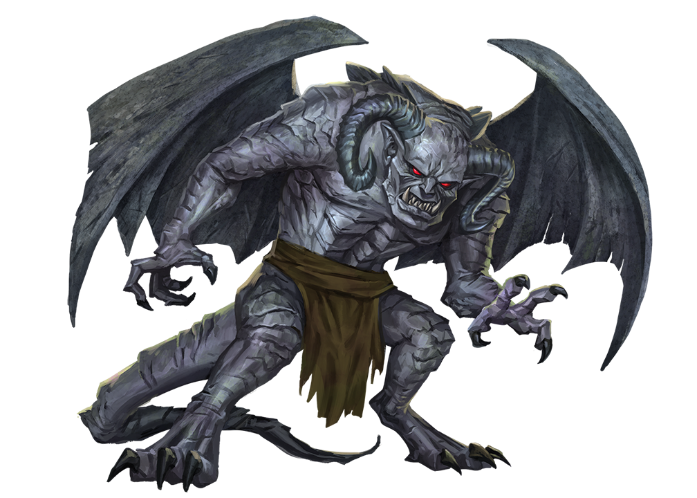 Gargoyles often appear to be winged stone statues, for they can perch indefinitely without moving, allowing them to surprise their foes. Gargoyles tend toward obsessive-compulsive behaviours that are as varied as their kind is plentiful. Books, stolen trinkets, weapons, and grisly trophies harvested from fallen foes are just a few examples of the types of things a gargoyle might collect to decorate its lair and territory. Gargoyles tend toward a solitary lifestyle, though they sometimes form fearsome groups called “wings” for protection and sport. In certain conditions, a tribe of gargoyles might even ally with other creatures, but even the most stable alliances with a gargoyle tribe can collapse for the smallest of reasons—gargoyles are nothing if not treacherous, petty, and vindictive. Gargoyles have been known to dwell in the heart of the largest of cities, crouching amid the decorations of stone cathedrals and buildings where they hide in plain sight by day and swoop down to feed on vagabonds, beggars, and other unfortunates at night.