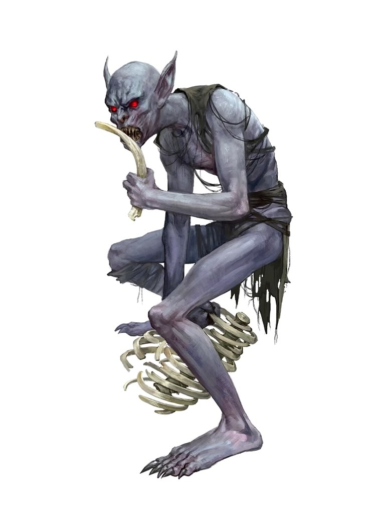 Ghouls lurk on the edges of civilization (in or near cemeteries or in city sewers) where they can find ample supplies of their favorite food. Though they prefer rotting bodies and often bury their victims for a while to improve their taste, they eat fresh kills if they are hungry enough. Though most surface ghouls live primitively, rumors speak of ghoul cities deep underground led by priests who worship ancient cruel gods or strange demon lords of hunger. These “civilized” ghouls are no less horrific in their eating habits, and in fact the concept of a well-laid ghoul banquet table is perhaps even more horrifying than the concept of taking a meal fresh from the coffin.