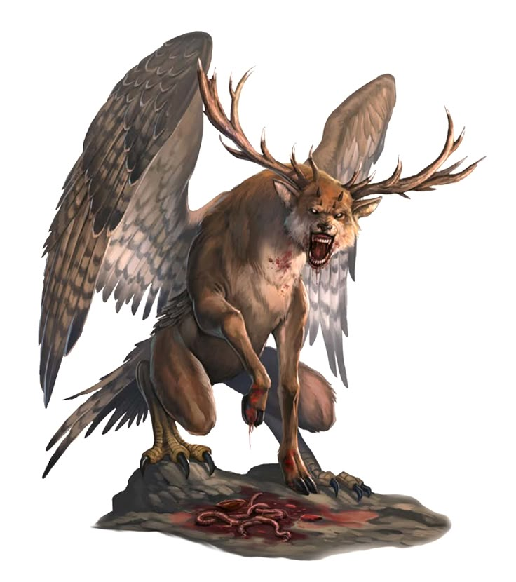 Savage creatures of nightmare, perytons combine the features of stags, wolves, and great birds of prey. Though vicious beasts, perytons possess all the intelligence of a human. Perytons hunt any creature weaker than themselves, but prefer humanoid prey, as they particularly relish the taste of such creatures’ still-beating hearts. Perytons loathe all other creatures, even their own kind, and adult male perytons often attack one another on sight. However, strong females sometimes lead small family flocks composed of the alpha female, two or three weaker females, and up to six fledglings. The flock drives off males when they come of age, but females are allowed to join the pack when they mature, provided they swear allegiance to the alpha female. Unpaired males frequently attack such flocks in the hope of making off with a mate; failing that, they approach more peacefully, with offers of warm humanoid hearts (or even still-living victims) to attract females.