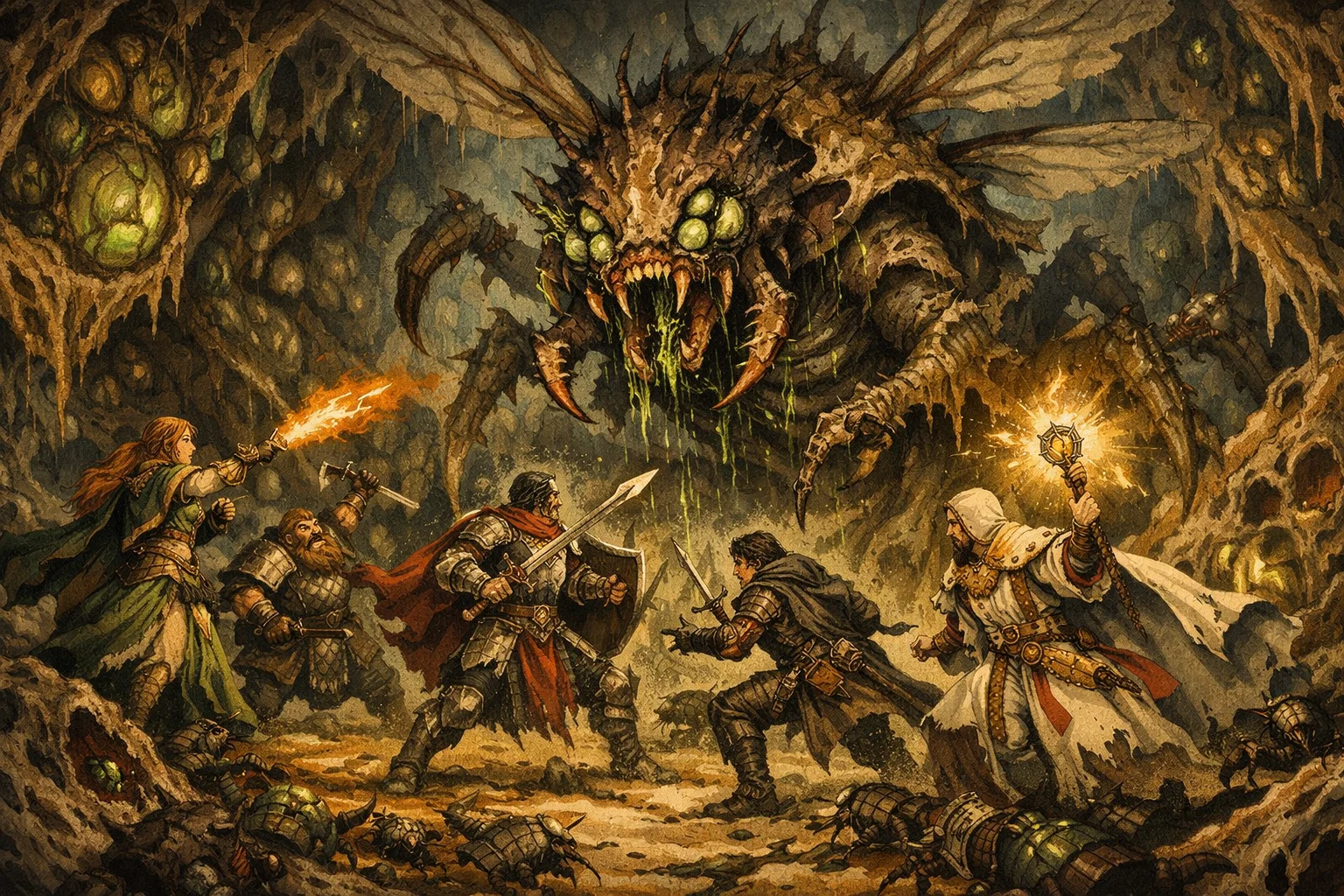 There was no time to chase answers. Cloaked in MotoGP invisibility and moving with care, the party slipped past the drifting edges of the swarm and descended into the vermin’s tunnels. The air grew thick, the walls slick with chitin and rot. Avoiding smaller clusters, they pressed onward until they reached the heart of the nest. There, the vescavor queen waited—vast, pulsing, and hideous. The battle was fierce, wings and mandibles thrashing in the dark, but at last the creature fell.